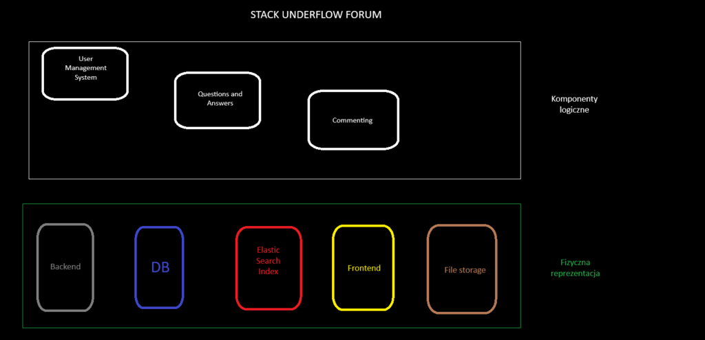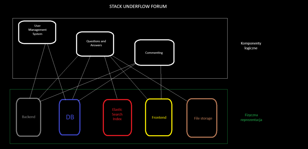 Reprezentacja fizyczna będzie pokazywała z jakich klocków składa się system (bazy danych, backend, frontend) a także może pokazywać mapowanie komponentów logicznych na reprezentację fizyczną. Przykładowo: