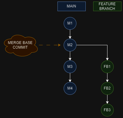 git merge-base MAIN FEATURE_BRANCHjeśli zostanie znaleziony wspólny przodek, to zostanie zwrócony jego commit id (sha). Przykładowo: