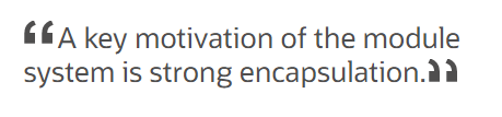 Moduły zostały wprowadzone w celu zapewnienia większej enkapsulacji – dzięki nim możliwe jest między innymi używanie publicznych klas w ramach modułu bez obawy, że ktoś będzie mógł zaraz ich użyć. Moduły pozwalają na deklaracje tego co może być używane, a co nie. Czytamy na stronie dotyczącej modułów: