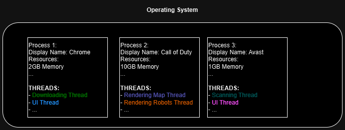 Wątek – to coś co działa w ramach procesu i możliwe jest działanie wielu wątków w ramach jednego procesu. Wątki współdzielą zasoby: